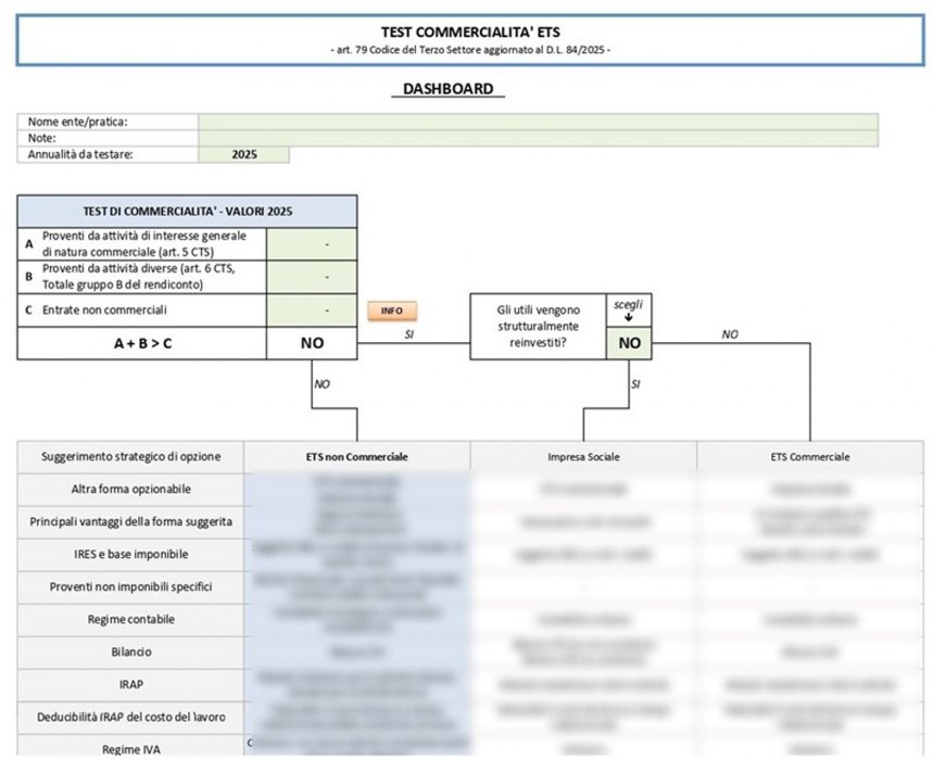 Il Tool Test Commercialità ETS è la soluzione digitale in excel studiata per supportare gli Enti del Terzo Settore (ETS) nella verifica della loro natura commerciale, in vista della piena applicazione del Codice del Terzo Settore dal 31 marzo 2026.
