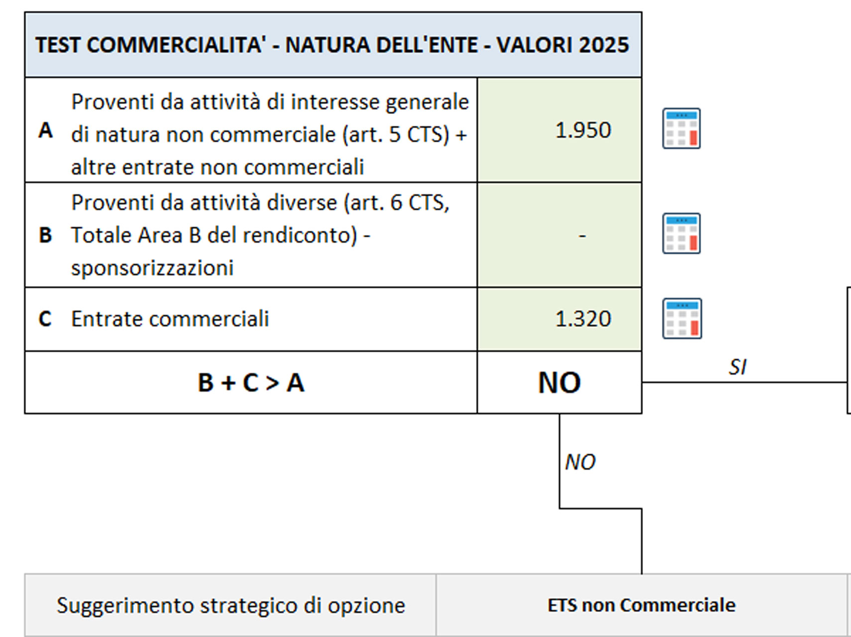 Poiché le entrate non commerciali > commerciali, l’ente mantiene la qualifica di ETS non commerciale per l’anno 2025, come evidenziato dal tool: