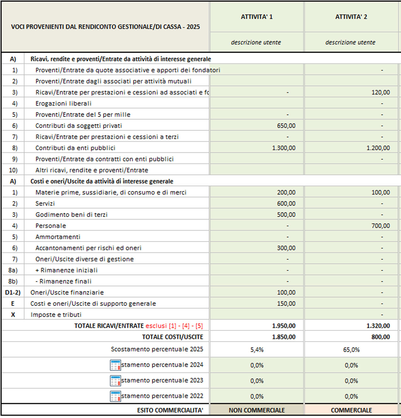 - sommiamo tutte le entrate non commerciali (Attività 1, donazioni, contributi pubblici, 5 per mille, ecc.);