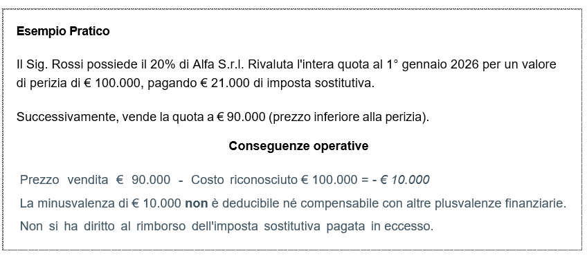 Può accadere che, successivamente alla rivalutazione, il prezzo di mercato scenda e la vendita avvenga a un prezzo inferiore al valore periziato. In questo scenario: