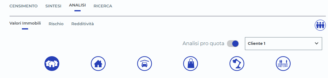 Inserendo il solo codice fiscale del cliente, il software è in grado di estrarre i dati catastali relativi agli immobili intestati al soggetto. Ogni bene viene analizzato e stimato puntualmente, utilizzando criteri omogenei e aggiornati. Gli immobili vengono poi suddivisi per tipologia – abitativi, commerciali, terreni – e per concentrazione territoriale, offrendo una visione chiara della distribuzione geografica del patrimonio.