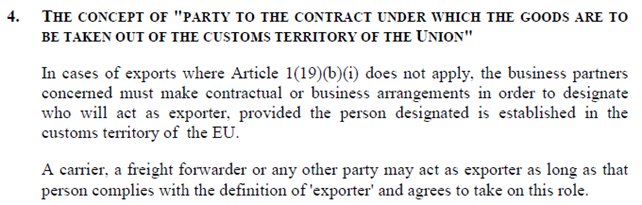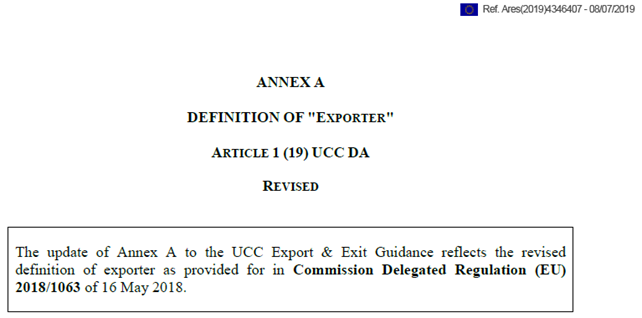 Ciò in quanto la definizione di “esportatore” contenuta nell’articolo 1, punto 19 del Regolamento UE n. 2446/2015 (RD) (come riformulata dal Regolamento Ue n. 1063/2018) identifica quale soggetto esportatore: