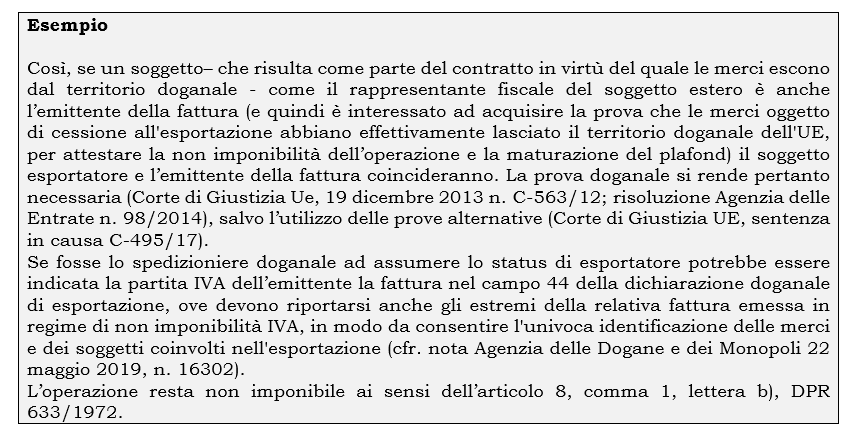 Così, se un soggetto– che risulta come parte del contratto in virtù del quale le merci escono dal territorio doganale - come il rappresentante fiscale del soggetto estero è anche l’emittente della fattura (e quindi è interessato ad acquisire la prova che le merci oggetto di cessione all'esportazione abbiano effettivamente lasciato il territorio doganale dell'UE, per attestare la non imponibilità dell’operazione e la maturazione del plafond) il soggetto esportatore e l’emittente della fattura coincideranno. La prova doganale si rende pertanto necessaria (Corte di Giustizia Ue, 19 dicembre 2013 n. C-563/12; risoluzione Agenzia delle Entrate n. 98/2014), salvo l’utilizzo delle prove alternative (Corte di Giustizia UE, sentenza in causa C-495/17).