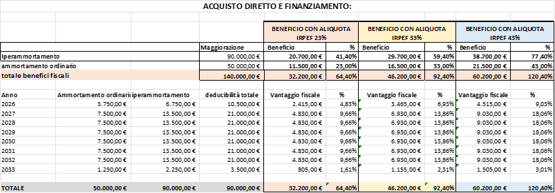 Rispetto all'acquisto diretto, il leasing finanziario consente di concentrare la deduzione fiscale maggiorata in un periodo significativamente più breve, poiché la durata del contratto di leasing è spesso inferiore alla vita utile del cespite, il recupero fiscale tramite la deduzione dei canoni maggiorati avviene in tempi ridotti, migliorando il flusso di cassa aziendale e mantenendo la liquidità disponibile per altri investimenti I canoni (e la maggiorazione) sono deducibili in un periodo minimo pari alla metà del periodo di ammortamento.