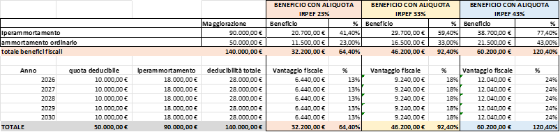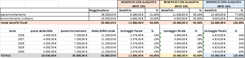 Con l'iperammortamento come potete vedere con gli esempi pratici si può ottenere un beneficio fiscale in risparmio di tasse che è nettamente superiore al valore nominale del bene (imponibile) acquistato.