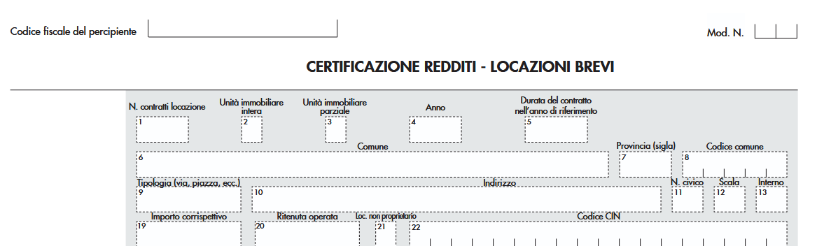 Relativamente al tali tipologia di locazione, come previsto dall’art.1, comma 78 della legge 30 dicembre 2024, n. 207, nell'ultima pagina della CU 2026, occorre indicare nel punto 22 il codice identificativo nazionale (CIN), di cui all’art. 13-ter del decreto-legge 18 ottobre 2023, n. 145, convertito con modificazioni dalla legge 15 dicembre 2023, n. 191.