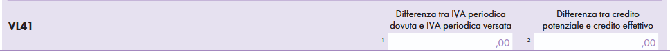 - campo 1, la differenza, se positiva, tra l’IVA periodica dovuta e l’IVA periodica versata, pari alla differenza tra il campo 2 e la somma dei campi 3, 4 e 5 del rigo VL30;