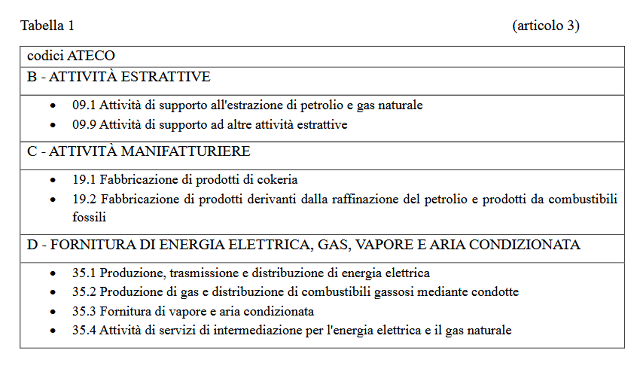 - ai soggetti individuati nella Tabella 1 allegata al decreto (estrazione, raffinazione, produzione e distribuzione energia e gas).